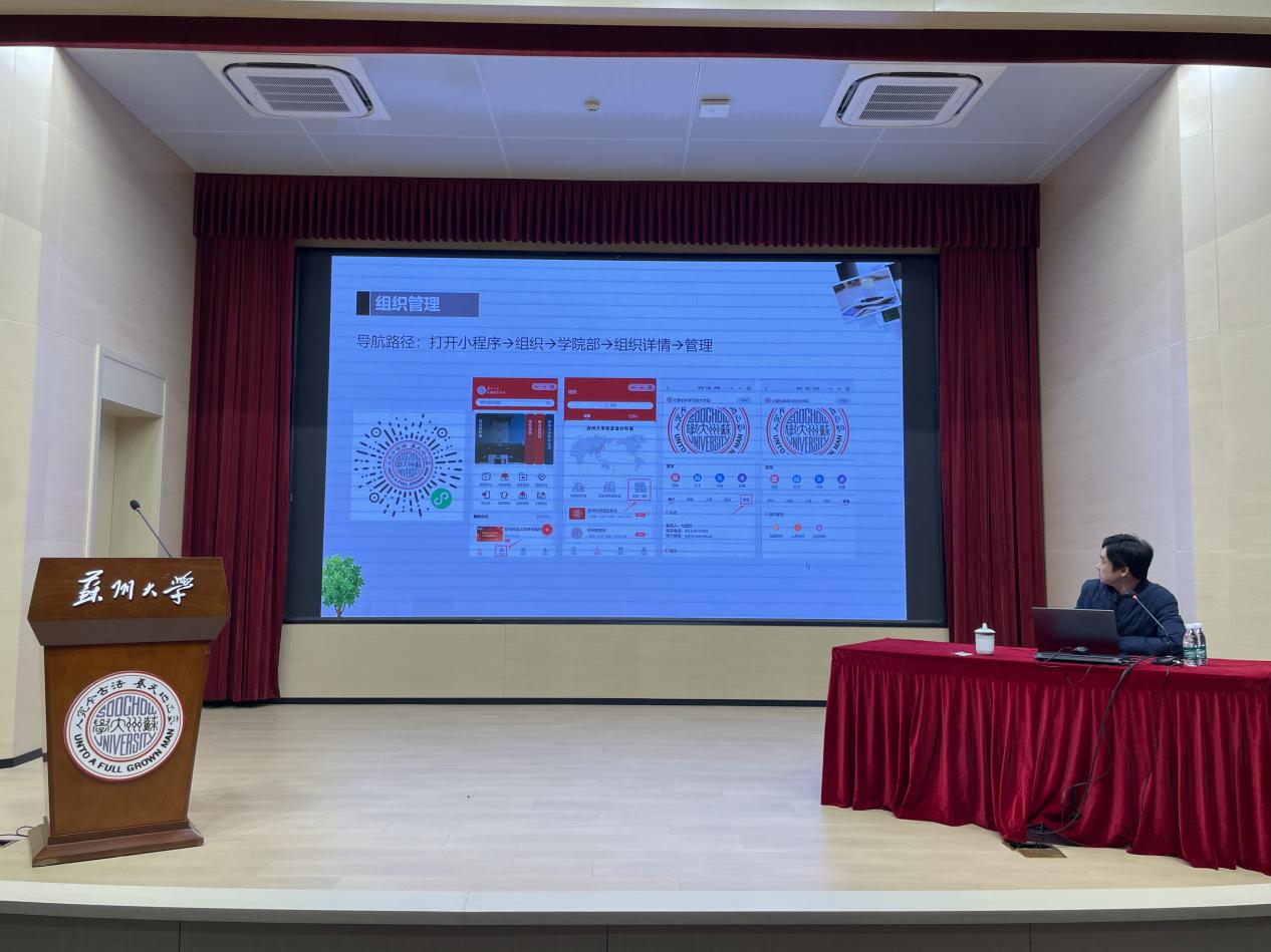 培训会由苏州大学校友工作办公室副处长、苏州大学校友会副秘书长徐冉主持。他结合学校校友工作战略规划,强调了全球校友平台作为校友联络核心枢纽的重要性,并详细讲解了作为平台管理员账号审核的标准流程及常见错误案例,要求各学院(部)严格把控校友信息质量,确保平台数据的准确性与安全性。