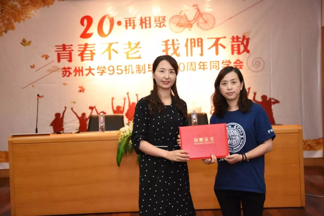 副书记袁红代表学院向95级机制校友表示感谢,一进机电门,一世机电情,各位校友心怀苏大,心系机电,这次的捐赠既是对学弟学妹们的关爱,更是对母校、母院的感恩,相信同学们一定会积极进取,向校友学习,追求卓越,传承爱心,丰富自我,奉献社会。随后,袁红副书记代表学院向校友颁发了机电工程学院成长陪伴助学金捐赠证书。
