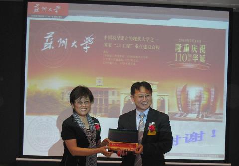 在苏大新西兰校友会成立仪式上,苏州大学校长朱秀林先生亲自为大会发来了贺信,苏州大学校友会秘书长杭晓平女士介绍了苏州大学的历史和发展现状,并向校友们介绍了苏大校友总会的工作情况和明年苏州大学成立110周年的校庆筹备情况。杭秘书长还分别向张利民大使和王小选会长赠送了苏州大学纪念品。