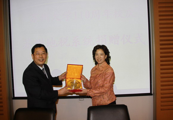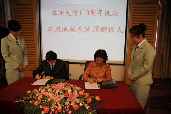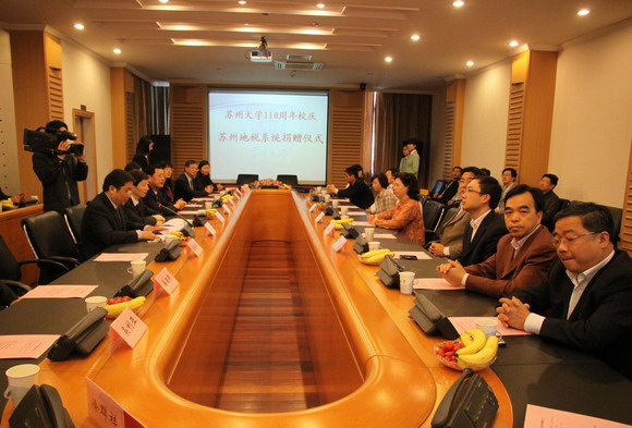 在喜迎苏大110周年校庆之际,苏州市地方税务局为我校校庆捐款50万元,税务局系统内二百八十名苏大校友为母校校庆捐款 9万余元。5月11日上午,捐赠仪式在我校本部红楼会议室隆重举行。苏州市地方税务局局长华雅琴、副局长孙振华、党组成员、纪检组长刘烨、党组成员、总经济师周晓以及市地税系统分局领导、机关领导、校友代表出席了会议,我校校长朱秀林、副校长陈一星以及相关职能部门领导参加了会议。会议由校党委副书记、副校长江涌主持。
