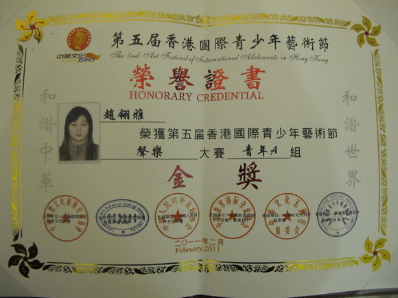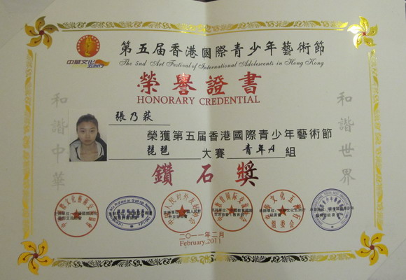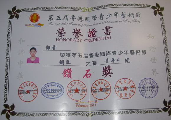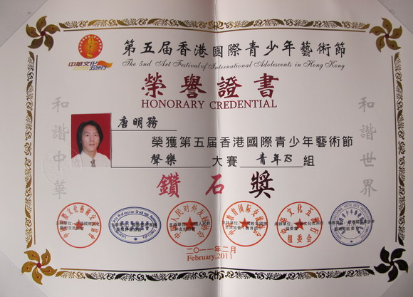 近日,在刚刚落幕的第五届香港国际青少年艺术节上,我校艺术学院音乐系师生凭借自身扎实的专业功底和良好的舞台竞技素质,从众多选手中脱颖而出,一举夺得音乐类三个钻石奖和一个金奖的优异成绩。其中,唐明务老师获得声乐类青年B组钻石奖,2008级同学赵翎雅获得声乐类青年A组金奖,2009级同学郑星获得钢琴类青年A组钻石奖,2009级同学张乃荻获得琵琶类青年A组钻石奖,为我校争得了荣誉。