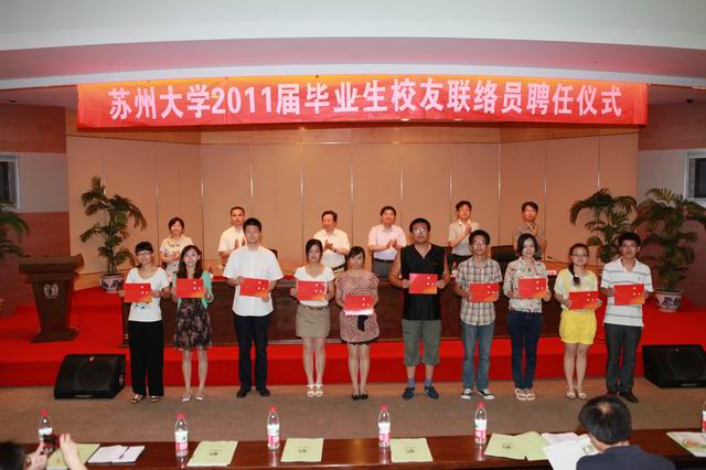 2011年6月22日上午,我校分别在校本部学术报告厅和独墅湖炳麟图书馆学术报告厅举行了2011届毕业生校友联络员聘任仪式。校党委副书记、副校长、校友会副会长江涌,发展委员会办公室主任、校友会秘书长薛辉,宣传部、学生处、团委等相关部门负责人以及各学院(部)分管学生工作的领导出席了聘任仪式。此次聘任仪式由发展办副主任、校友会副秘书长张洁主持。