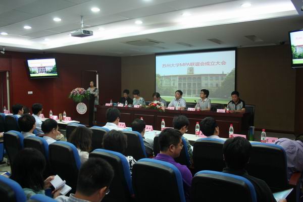 2011年7月9日,苏州大学政治与管理学院四楼学术报告厅,红幅高悬、花团锦簇,苏州大学MPA联谊会成立大会在这里隆重召开。苏州大学校党委副书记、副校长、校友总会副会长江涌,党委宣传部部长陈进华,发展委员会办公室主任、校友总会秘书长薛辉,研究生部副主任吴雪梅,政治与公共管理学院院长金太军,副院长姜建成、邢光晟、车玉玲等领导应邀出席会议。会议还特邀苏州工业园区湖西社区党工委书记田太促,江苏丹阳市市委党校校长虞伟,皇第锅盖养生餐饮有限公司董事长宋琦,苏州苏御宇酒业公司董事长王裕中;南京大学、南京农业大学、扬州大学、东南大学、中国矿业大学、南京理工大学、南京师范大学、河海大学等MPA院校的领导及其MPA联谊会骨干成员,苏州市培训中心的领导到会祝贺。省内九所MPA院校、常州市人事培训中心、苏州工业园区湖西社区工委、盐城工学院成人教育学院等单位纷纷发来贺信,对今后校级之间、学校与政府间通过经验分享、平台共建实现联合发展提出了很好的倡议。成立大会有近100人出席。