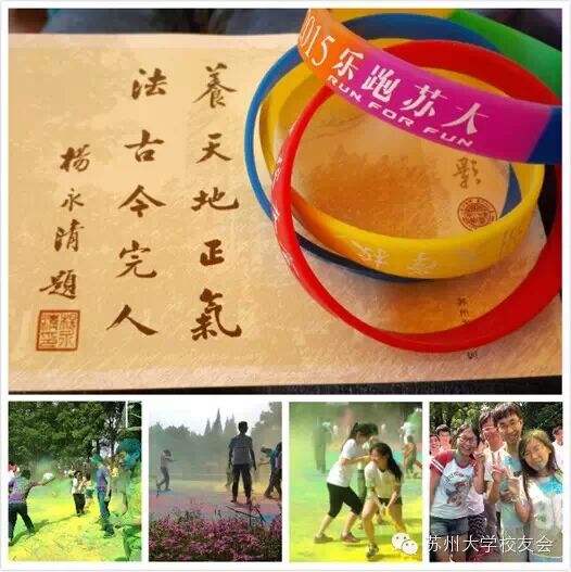返校日当天举行的“乐跑苏大”的活动将活动推向了其乐无穷的制高点,继精彩的拉拉队操和舞狮表演之后,表演报名参加健身跑步活动的校友和苏大学子们齐聚本部钟楼前的大草坪,在签到领取活动文化衫和号码牌等装备之后,便是在专程而来的ho麦选手美妙且鼓舞人心的歌声中,跃跃欲试地等待首先在13:30进行的健康跑活动了。此活动由两部分组成:健康跑和欢乐跑。较之“健康跑”全程约4.5公里选手们拼尽全力地挑战耐力的比赛而言,全程约1.5公里的“欢乐跑”显得那么让人轻松愉悦。在结束了健康跑之后,更多的选手们都兴致勃勃的奔着欢乐跑而去,赛道之中“红区”树木上飘荡着写满祝福的许愿卡仿佛为校友、学子们呐喊助威,“黄区”狂欢彩虹站瞬间也成了欢乐疯狂的彩色海洋,大家尽情地在彩虹站中抛洒彩虹粉,就像是彩色的打雪仗一般,小伙伴们放下彼此不曾熟识的隔阂,欢快地“打”成一片。同时,“蓝区”的欢乐乒乓球项目也进行开来,刚刚结束在苏州举办的第53届的世乒赛掀起全民热爱乒乓的热潮。夹乒乓球、吸乒乓球、投乒乓球、吹乒乓球四个环节组成这个游戏,参赛选手认真投入的姿态绝不亚于世乒赛的选手们。参加每个赛区活动的选手都会得到相应颜色的手环,最后浑身布满炫彩粉末、佩戴着三色手环的选手都像是无冕之王,是自己的英雄。