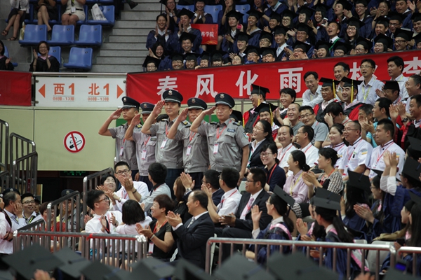 值得一提的是,在主持人介绍一群特殊的来宾时,雷鸣般的掌声和欢呼声响彻整个会场。这群“可爱的人”便是食堂工作人员、宿管员、保安大叔,他们多年如一日坚守岗位,服务师生。这些校园后勤一线工作者纷纷表示非常感动能够受邀参加这次仪式,看到这群毕业生就好像看到自己的孩子一样,临别之际,祝福毕业生们前程似锦。