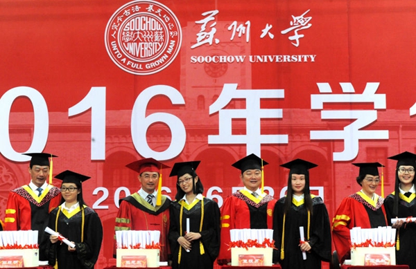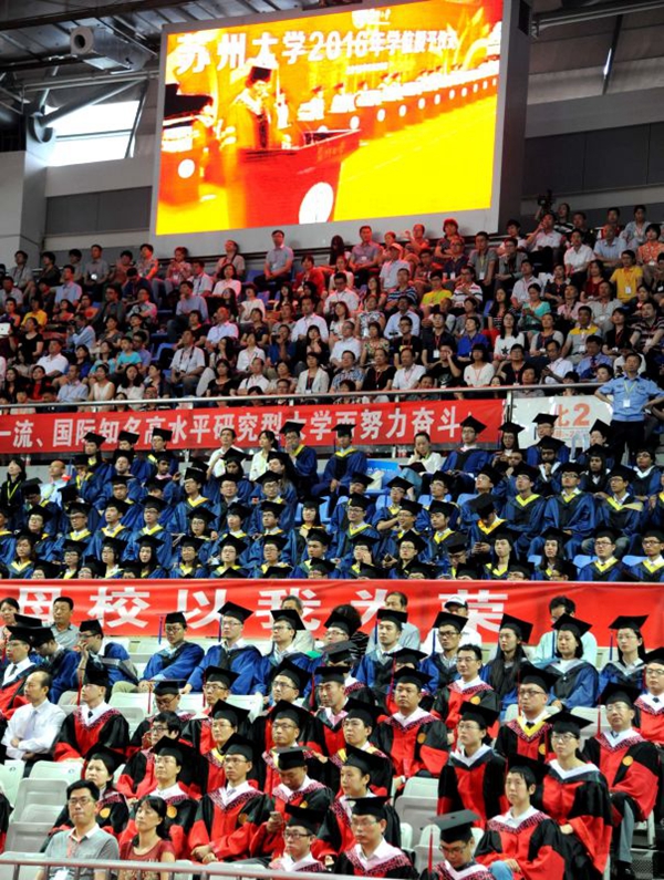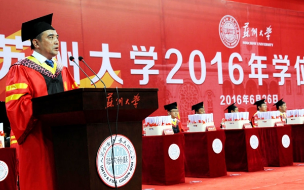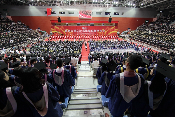 6月26日,苏州大学2016年学位授予仪式在独墅湖体育中心隆重举行。校领导熊思东、袁银男、田晓明、高祖林、江作军、蒋星红、陈卫昌,校学位评定委员会委员,全体毕业生、部分毕业生家属亲友代表,各学位评定分委员会成员、博士生导师、相关职能部门负责人、各学院(部)领导、教师与辅导员代表、后勤工作人员代表等近万人共同参加了本次盛大的学位授予仪式。