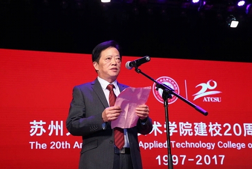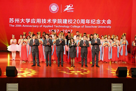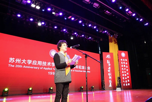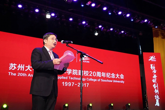 苏州大学党委书记江涌代表苏州大学党委和行政,向学院全体师生以及广大校友致以亲切问候和热烈祝贺!他说,二十年来,应用技术学院负重致远、励精图治、与时俱进、追求卓越,在机遇与挑战并存的教育改革大潮中,学院师生积极探索,努力前行,取得了一项又一项显著的成就,培养了一批又一批为地方经济社会发展服务的优秀人才,积淀了朴实深厚的人文底蕴,探索走出了一条特色鲜明的应用技术大学建设之路。20周年院庆,是苏大应用发展史上的一个重要里程碑,希望应用技术学院以本次纪念大会为新的起点,在十九大精神的鼓舞下,在科教兴国的战略指引下,不断深化教育改革,不断提升办学水平,为苏州大学再添光彩,为地方经济社会发展做出新的更大的贡献。