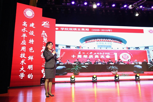 随后,学院院长傅菊芬向广大嘉宾和师生校友简要汇报了学院20年砥砺奋进的历程,回顾了学院发展所经历的三个重要历史阶段:1997年至2005年的初创转制期、2005年至2010年的规模发展期、2010年至2017年的内涵建设期。傅院长强调,20年来学院始终坚守“应用型人才培养”的使命,牢固树立“具有创新思维、实践能力和职业素养的高层次应用型人才”的培养目标,坚持按照“加强理论、注重应用、强化实践、学以致用”的人才培养思路,逐步形成了“依托行业、强化应用、开放办学、高效管理”的办学特色,生动实践和探索了中国应用技术大学的建设之路。20年来,一代代“苏应人”不断丰富着“学以致用”的精神内涵,逐步形成了自己独有的文化——“能力为本”的匠心精神、“勤奋、开放、创新、执着”的价值理念和“服务奉献”的优良传统。不忘初心,方得始终。在党的十九大精神引领下,“苏应人”有足够的勇气和信心克难攻坚,借助国家新一轮应用型本科教育改革的东风,锐意创新,趁势而上,续写新篇,再创辉煌!