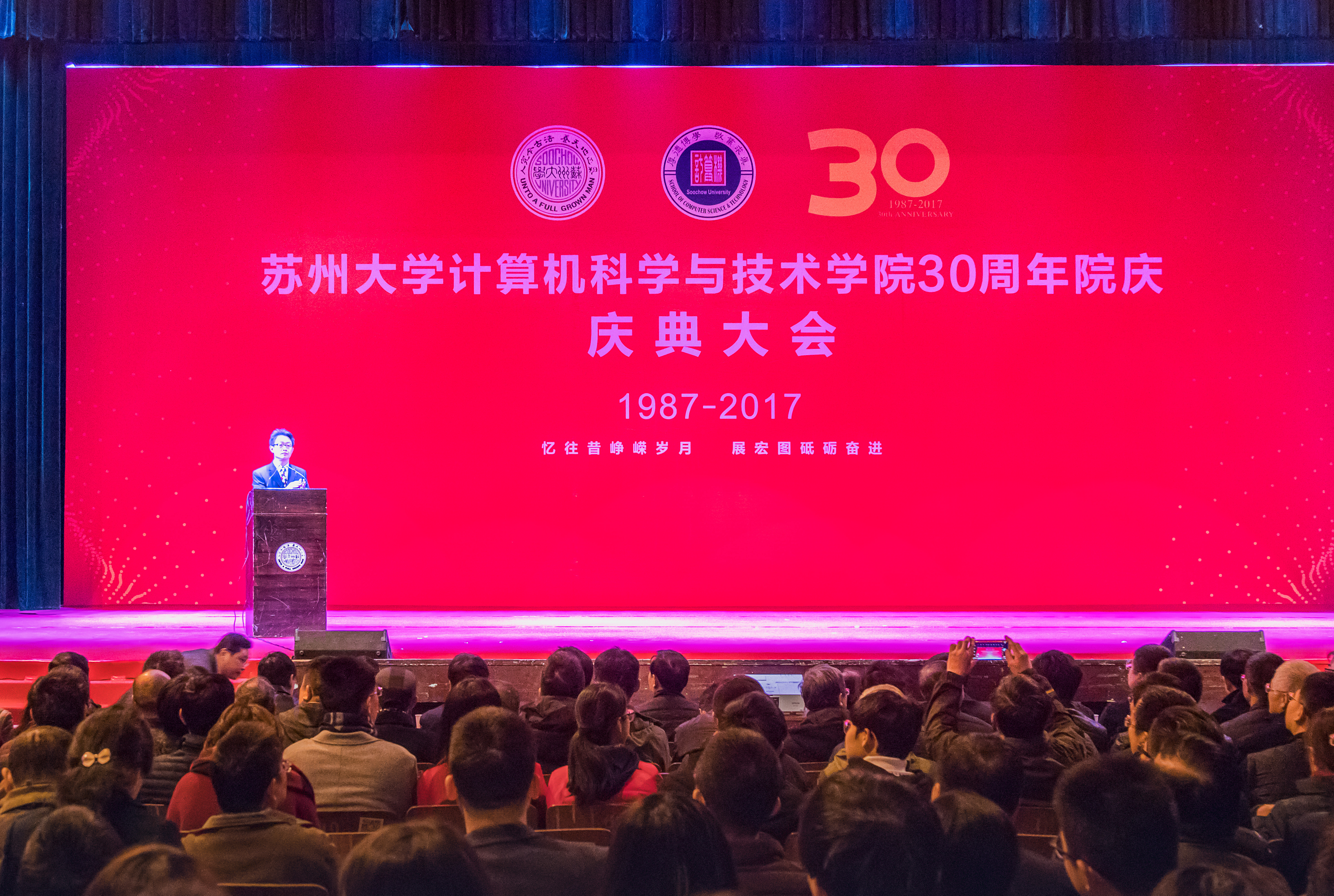 值此30周年院庆之际,许多兄弟学校发来贺电或赠送贺礼表示祝贺。计算机科学与技术学院院长李凡长回顾了学院30年的发展历史。1987年的12月9日,应苏州市社会发展需要,苏州大学工学院计算机工程系诞生,是江苏省较早开设计算机的专业之一。2002年,苏州大学计算机科学与技术学院正式成立。他指出,30年来学院已形成从本科、硕士、博士、博士后的完整人才培养体系,秉承“厚道博学,敬业求真”的院训,一直坚持“多维度协同”发展理念,坚守学术至上、学以致用,已为社会输送了7123名计算机和信息技术高级专业人才,为国家建设与社会发展做出了重要贡献。展望未来,他希望计算机科学与技术学院能建设成“国内一流、国际知名“的计算机学院。