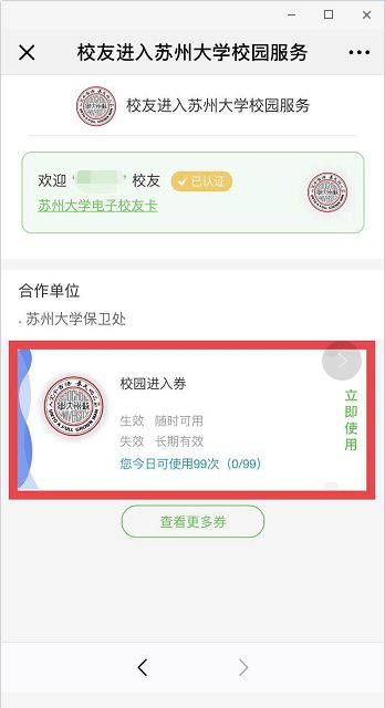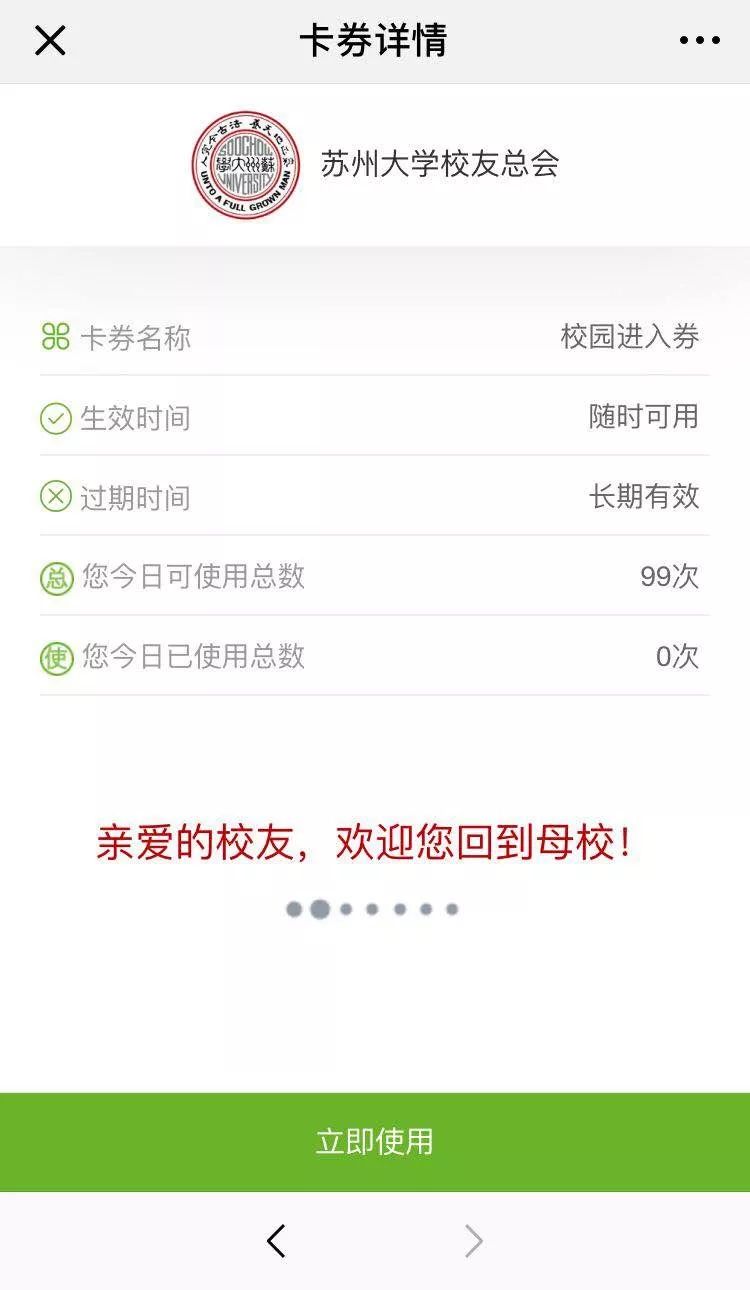 3、点击“校园进入券”,选择“立即使用”,进入欢迎页面后主动出示给门卫查看即可顺畅进入校园。
