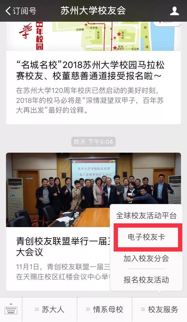 首先请关注“苏州大学校友会”官方微信平台sudaxyh,在自定义菜单中的“校友服务”栏目中,点击“电子校友卡”进入申请页面填写信息提交,待校友信息认证审核成功后即可收到领取提示。