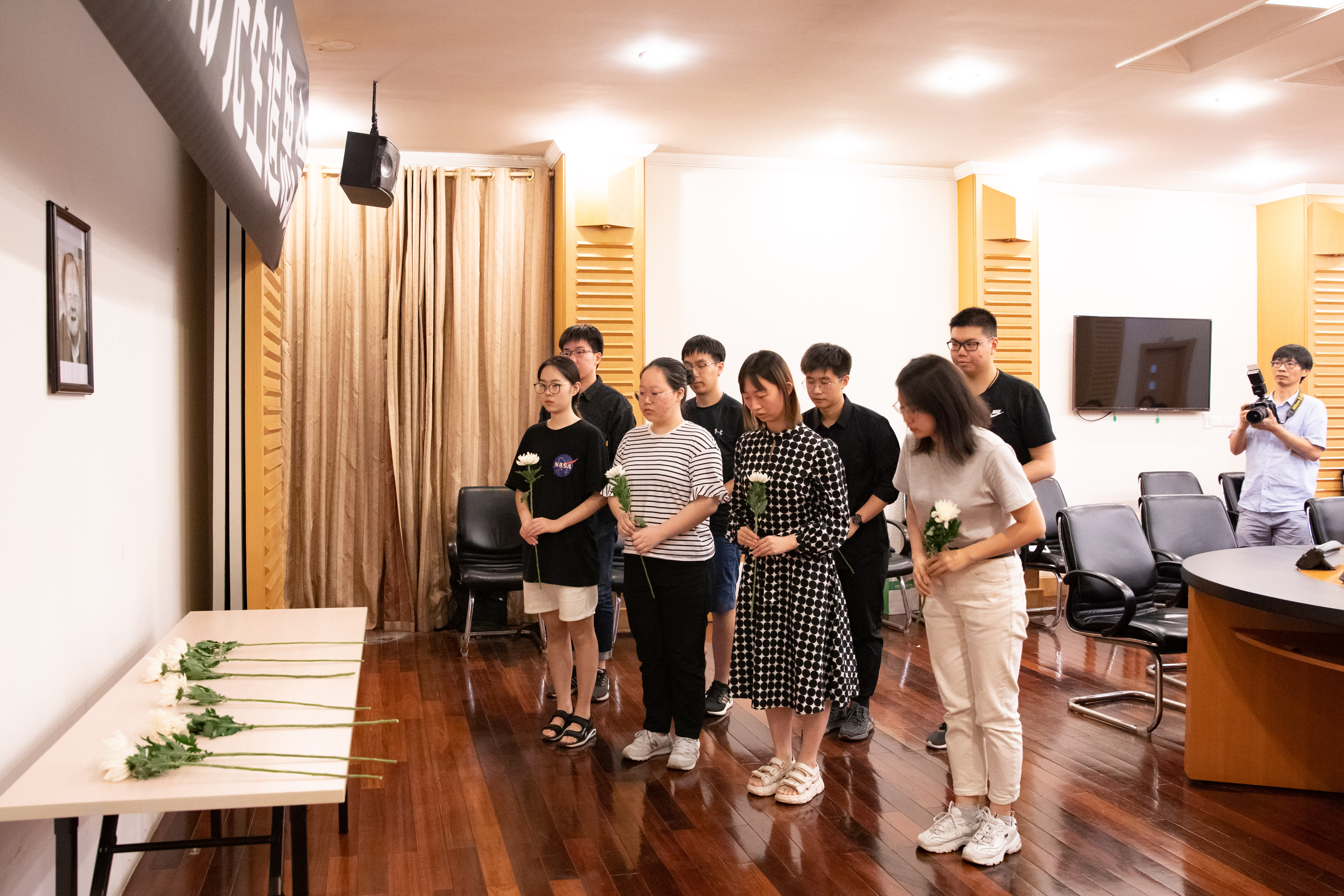 追思会正式开始前,与会师生依次向高文彬先生遗像敬献鲜花,一朵朵菊花寄托着苏大人对先生的哀思。追思会上,全体人员起立,为高文彬先生默哀。