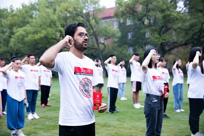 “东吴教泽,历久弥昌。负笈来游,祇率典常......”升旗仪式现场上,苏州大学校领导们分别为新生代表颁发苏州大学校徽、苏州大学学生管理规定及新生入学誓词。随着铿锵有力的誓言,一批年轻学子为百年苏大注入了新的蓬勃力量。