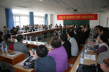 4月28日,阳光明媚、春风轻拂,在苏大北校区工科楼内,65级的校友联谊会在激情中举行。不少退休多年的老领导、老教授、老校友都闻讯赶来,九十多位当年的学生和老师欢聚一堂。会上,苏州大学路建美副校长介绍了母校的巨大变化和发展的新思路;校发展委员会办公室主任、校友总会杭晓平秘书长介绍了苏大校友总会的情况,代表校友总会赠送了纪念品给与会的校友;材料学院陈国强院长介绍了材料学院的历史变迁和发展方向;材料学院陈亦红书记、校发展委员会办公室陈向民副主任、王健副主任、材料学院办公室黄水慕主任等都到会表示欢迎和祝贺。由于与会校友较多,大家都有许多话要说,校友们自由发言时只能派代表。美术专业的老班长袁舜吾首先深情地回顾了毕业后的经历和自己的成长过程,并自豪地表示,我们这一届学生没有辜负母校的培养,在各自的岗位上都作出了优秀的贡献。接着制丝班的何独成同学以川式的普通话,朗读了在机场赶写的新词《江城子——贺戊子三月廿三姑苏同学聚会》。织甲班的马维贞同学以惊人的表达能力,用充满激情的语言,朗诵了《我们来到这里》的长篇抒情叙事诗,把同学聚会的激动兴奋与欢乐推向了高潮,许多同学都被感动得流下了热泪。印染班的孙林同学、织乙班的戴浩忠同学 、美术专业的游韵鹏、曹小卉同学,也都作了激情的感言。紧接着,谢自成老师、施兆祥老师、吴融如老师在同学们的热烈掌声中回顾了深厚的师生情谊和充满深情的感悟。