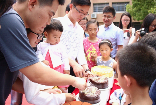 切蛋糕时,诱人的蛋糕吸引着台下的小朋友们簇拥而上,争先恐后,围在蛋糕前,场面甚是热闹。