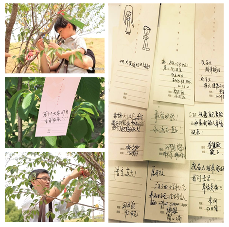 此次返校的他们有的结伴而来,有的携妻儿返校。校友们路过许愿祝福树的活动现场时,纷纷驻足写下自己的祝福与愿望然后亲自挂在许愿树上。通过我们观察发现,许多老前辈写的愿望都是对母校的祝福,有的祝母校万紫千红,有的祝母校跻身世界一流名校,他们对母校有着深深的眷恋之情,而这次返校也让他们感慨万千,每个人都愿意在许愿树上留下了自己的笔迹。与此同时,许多年轻的校友写的愿望就多种多样了,他们有的是与结伴而来的同伴互相祝福,有的是祝愿自己事事顺利,有些已经成家生子的就祝愿家庭美满,孩子健康成长等,在这些祝福中,值得一提的是陪着家长前来的孩子们的祝福,大一点儿能够识字的孩子祝愿自己快乐成长,而小一点儿连字都不认识的小朋友就直接用画代表着自己的祝福与愿望……他们所有人的积极参与共同打造出了美好漂亮的许愿祝福树。