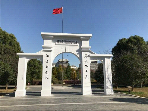 走近校友林,首先入眼的便是巍峨肃立的三拱门。器宇轩昂的拱门两侧镌刻着苏州大学的校训"养天地正气,法古今完人",这简短却有力的十个字无言地鞭策着一代又一代的苏大学子,督促其勤于修身宽以待人。迎着飒飒的秋风,绿叶就此悄无声息的换上了秋衣。片片似镀了金箔的银杏叶,薄如蝉翼,在风中微微抖动,仿佛在与过往的学子打着招呼。在校友林的周围,我们可以看到穿行而过苏大学子,漫步于金黄灿烂的银杏林无疑是对心灵的一次熏陶。