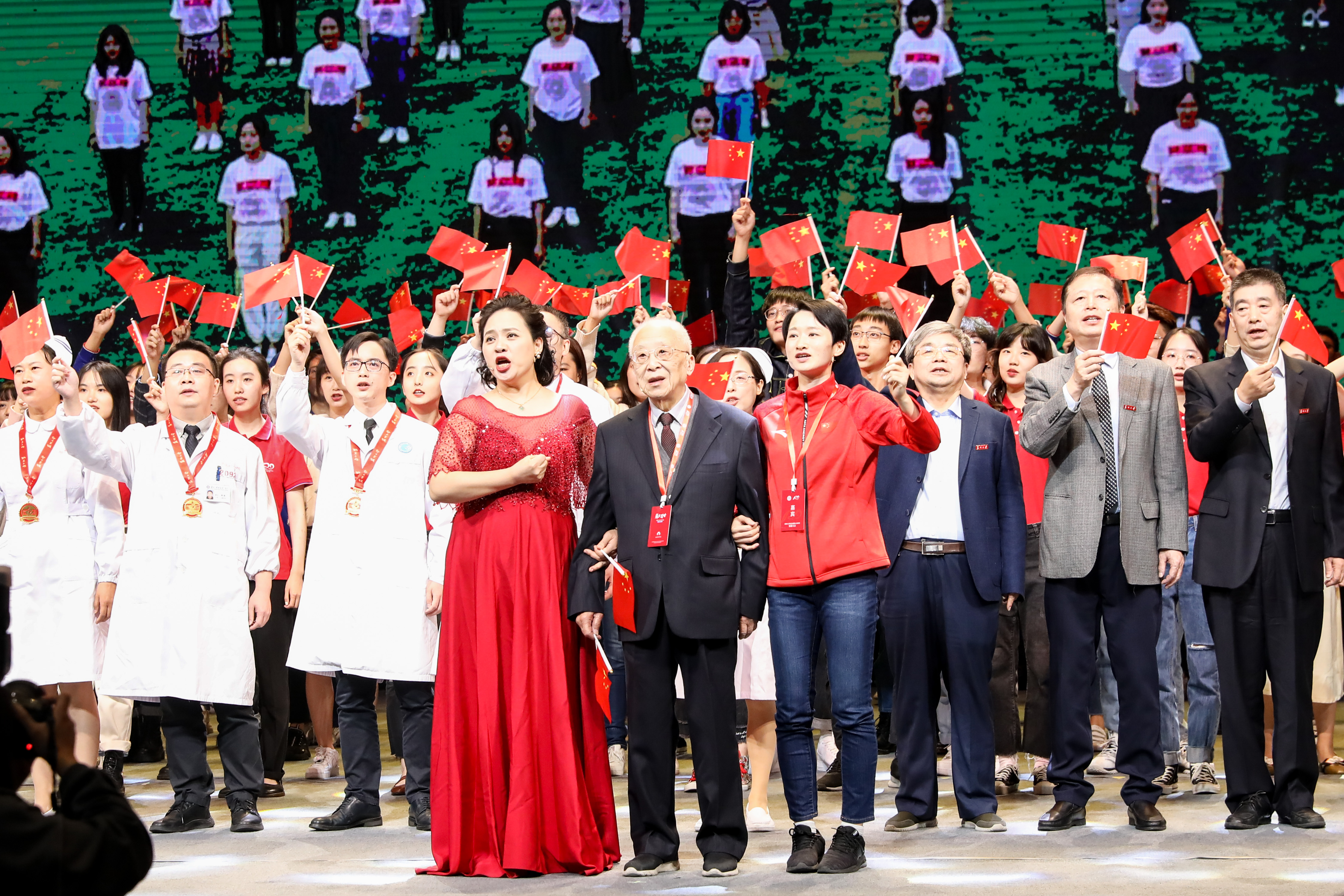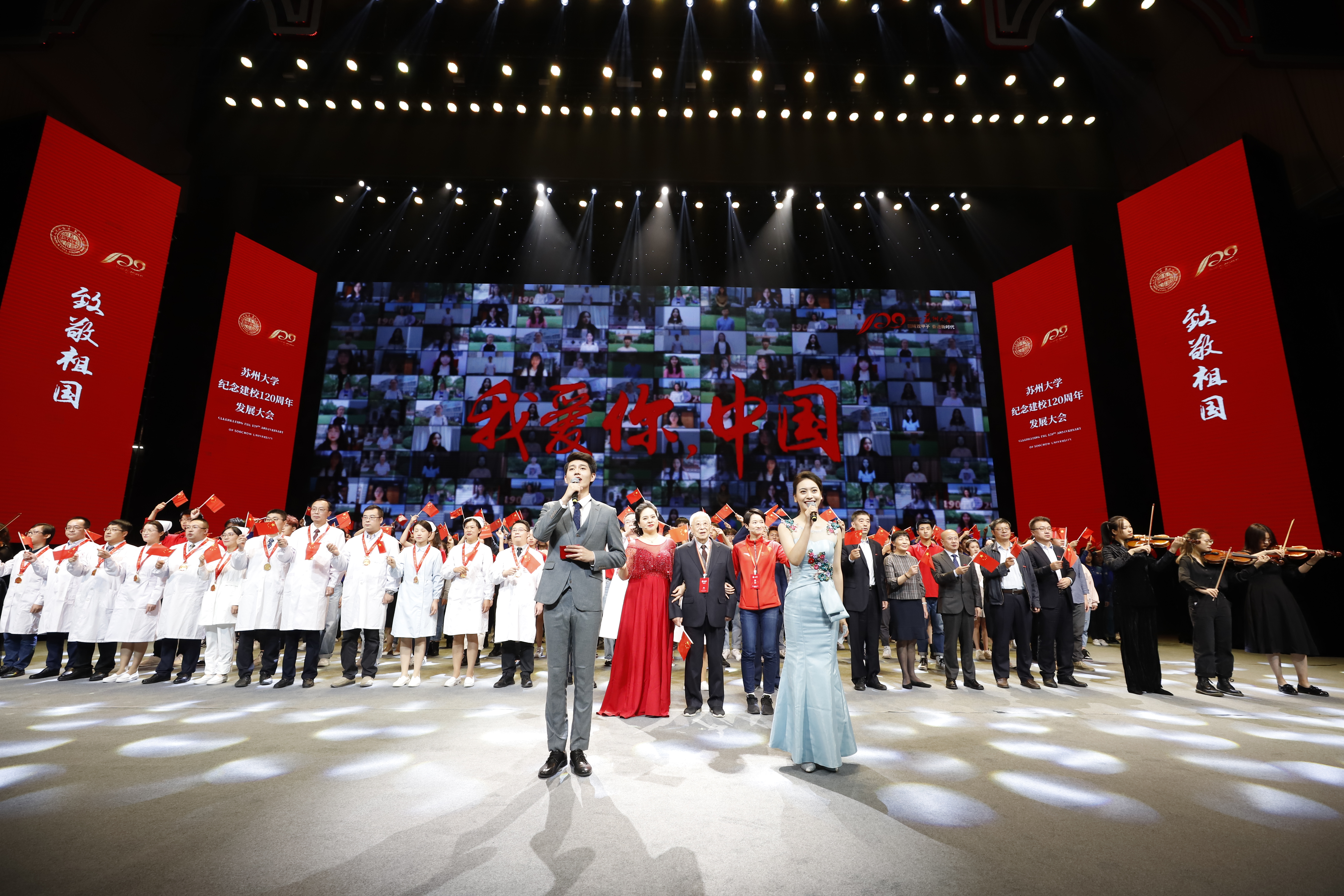 一条大河波浪宽,风吹稻花香两岸……随着歌曲《我的祖国》响起,再次将发展大会的现场推向高潮。会场中,已90岁高龄、从事科研工作 68 年的中国工程院院士、苏州大学现代光学研究所研究员潘君骅起身领唱。随后,奥运冠军、苏州大学校友吴静钰挥舞国旗起身歌唱。苏州大学音乐学院声乐系老师、江苏省音乐家协会会员董艺媛的女高音激昂澎湃,点燃全场!