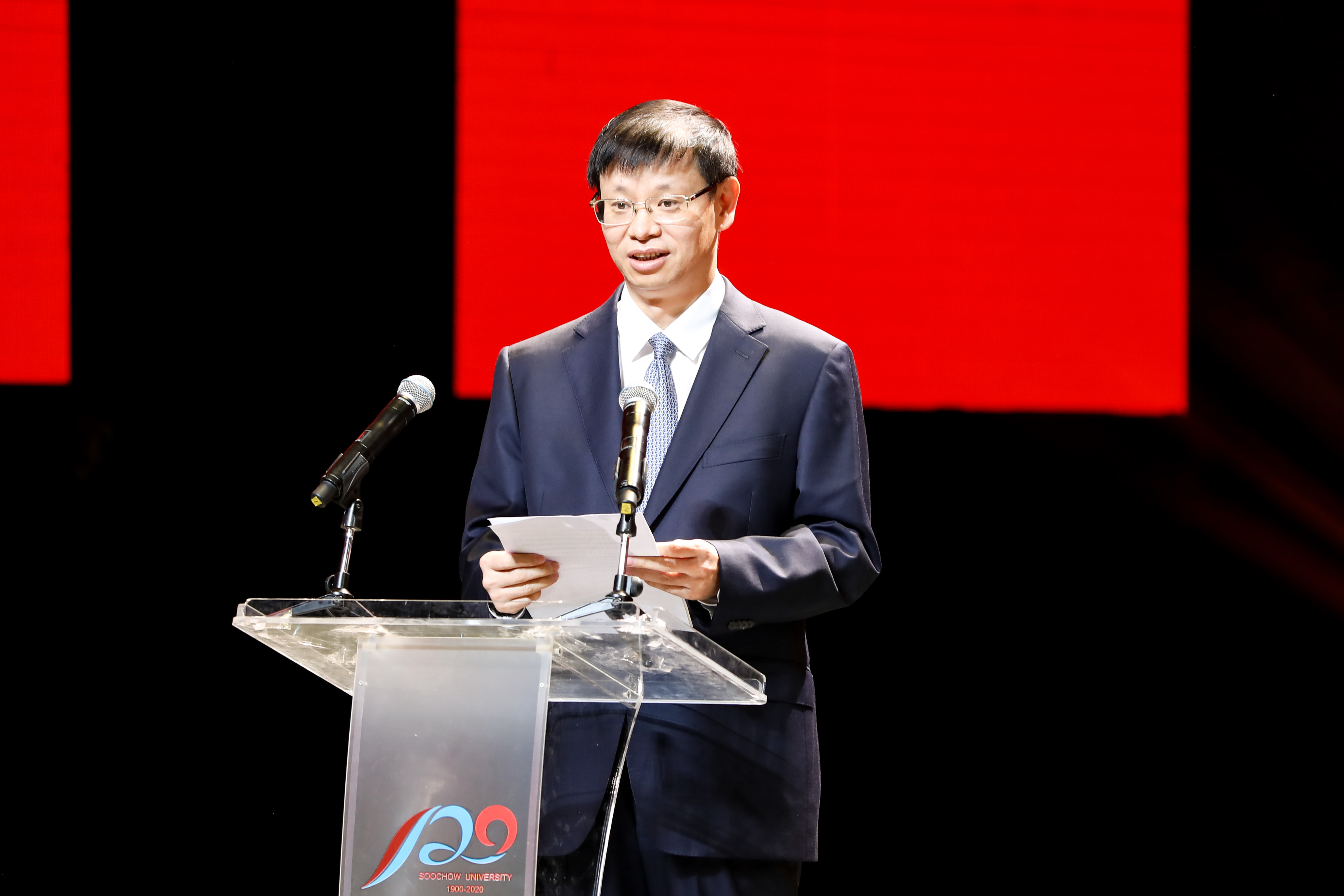 校友代表、中国工程院院士、北京大学常务副校长詹启敏到现场为苏大送上祝福。“母校的教诲始终都铭刻在我的生命中,苏大人的称号也成为我人生中重要的标签。”他表示,在苏大的学习生活塑造了自己的价值观和学术观、人格和素质,衷心祝愿母校能够在新的历史时期承前启后继往开来,相信苏大的明天一定会更加光辉灿烂。
