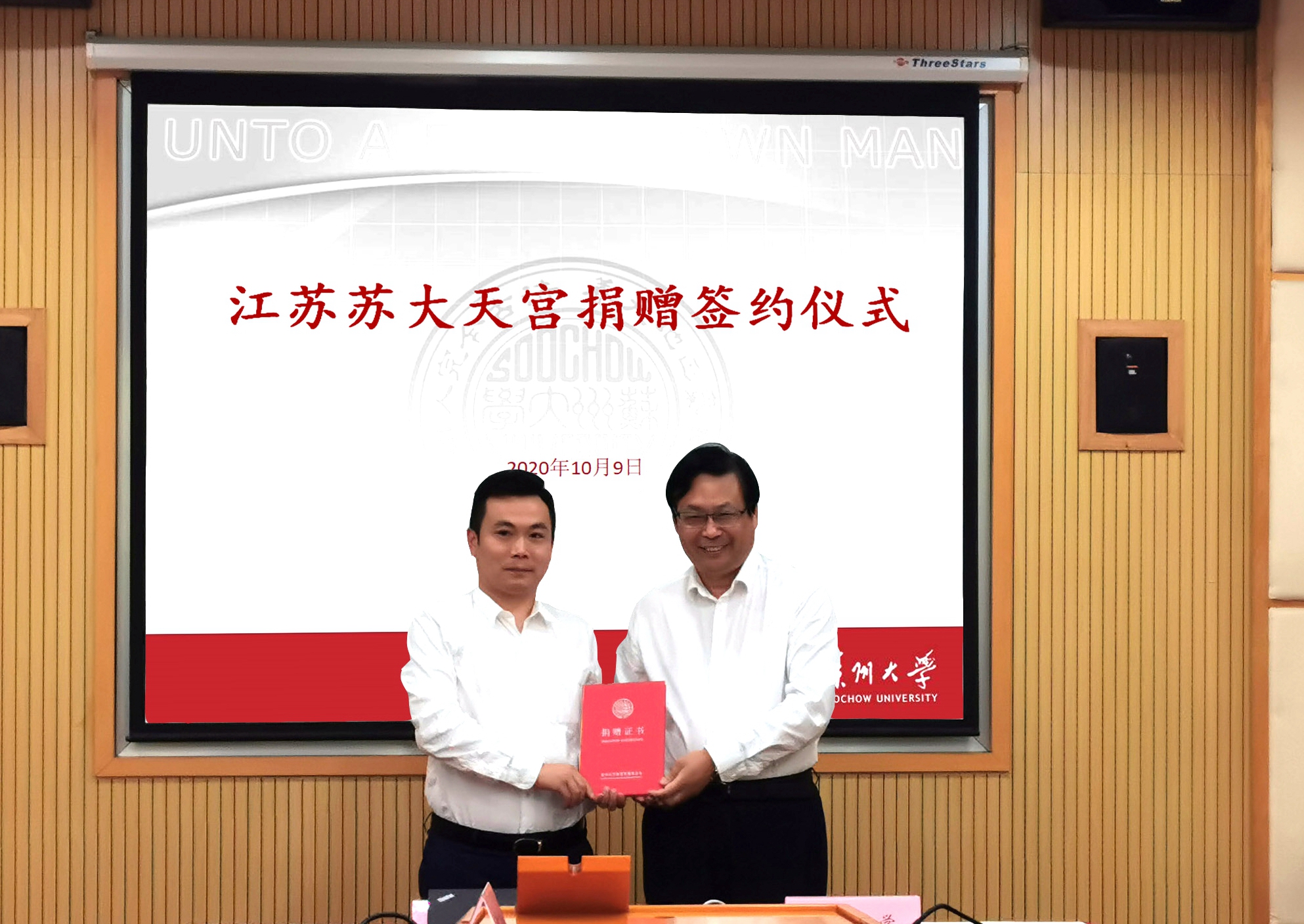 随后,袁方和发展委员会办公室主任胡新华分别代表江苏苏大天宫和苏州大学教育发展基金会签订捐赠协议。周高向袁方颁发了捐赠证书。