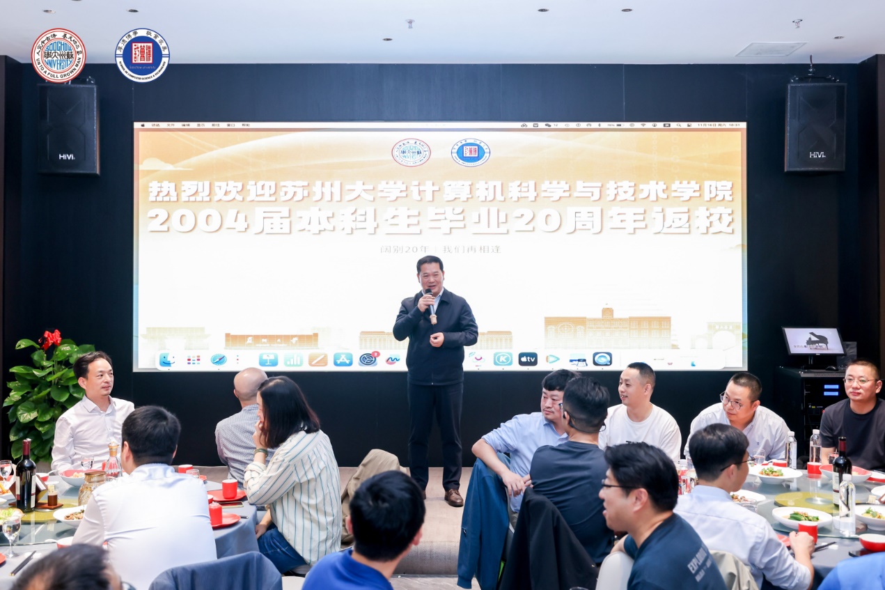 晚上6点,校友们共进晚餐。晚宴上,苏州大学计算机科学与技术学院党委书记胡新华致辞,学院原院长朱巧明教授、杨季文教授和04届师范班班主任朱斐教授应邀出席,他们与校友们共话往昔,展望未来。校友们就当前的行业发展、技术创新等话题进行了深入的交流和讨论,现场气氛热烈而温馨。