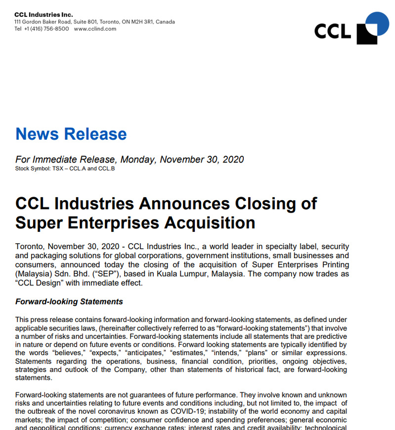 CCL集团,作为全球范围内的专业包装领导者,致力于为家庭和个人护理、高级食品和饮料、医疗保健和专业产品、汽车和耐用品以及全球消费市场提供创新解决方案。SEP公司是亚洲范围内消费电子及汽车行业的装饰面板、液晶和触摸屏显示盖及模具装饰组件的领先供应商。本次收购项目,是CCL集团将其业务迈入马来西亚的重大举措,同时也是CCL集团面对疫情依然坚持拓展的重要表现。