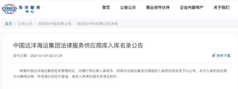 经过一年多的入库筛选程序,2021年新年工作首日,中国远洋海运集团(“中远集团”)在其采购及供应商管理工作系统平台上公布了法律服务供应商库入库名录,方本律师事务所成功入选法律服务供应商名录,本次入库的供应商为长期供应商。