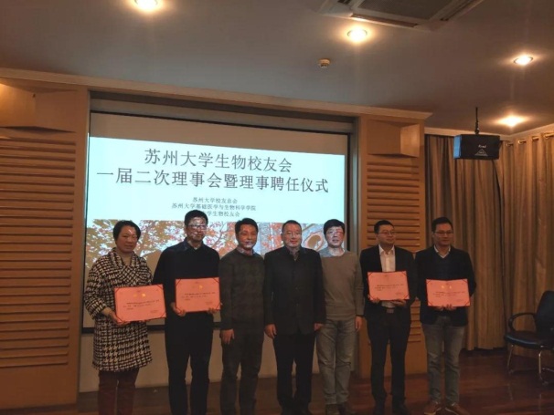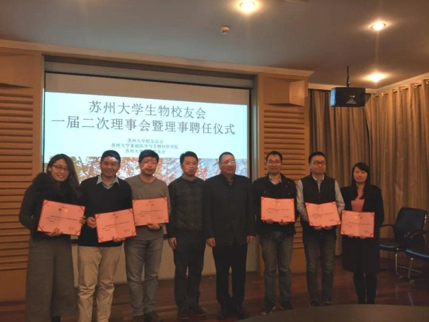 12月11日,生物校友会一届二次理事会会议暨理事聘任仪式在苏州大学天赐庄校区红楼会议中心举行,苏州大学基础医学与生物科学学院党委书记沈学伍,发展委员会办公室校友部部长管文文,以及生物校友会全体理事成员参加了会议。会议由生物校友会会长陆挺主持。