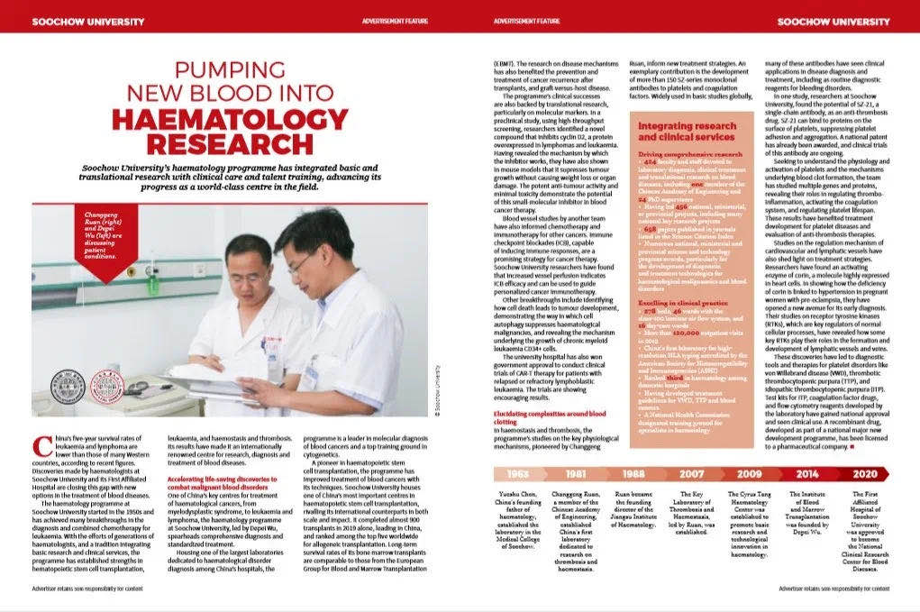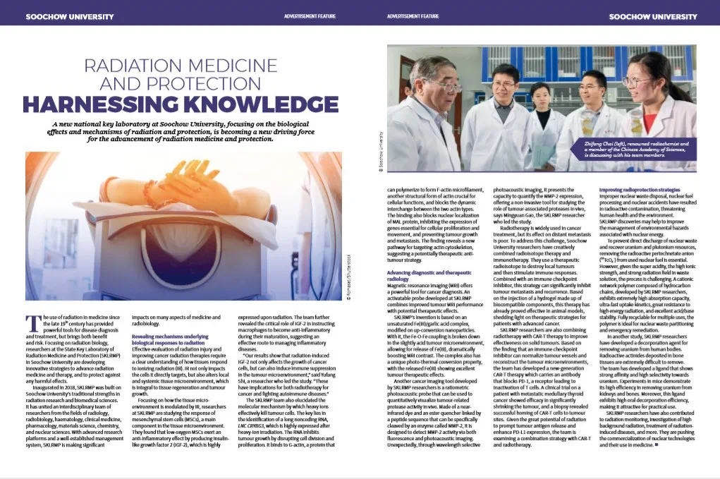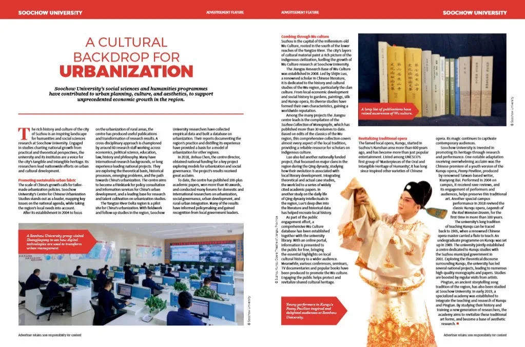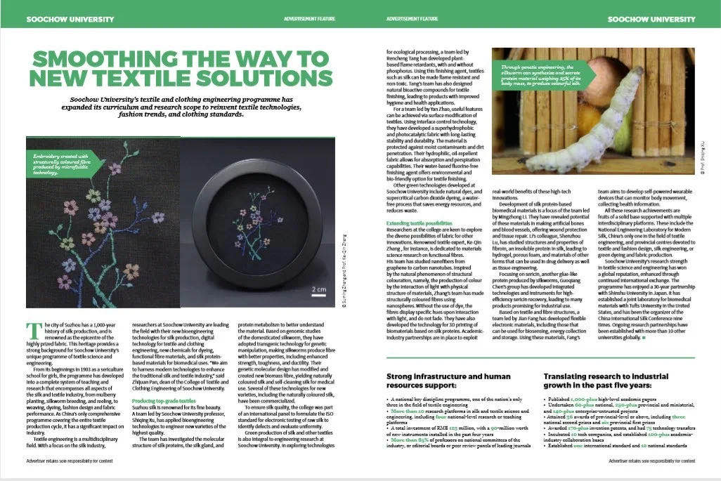 此外,《Nature》校庆特刊还刊登了苏州大学在纳米科学、放射医学与防护学、纺织与服装工程学、血液学、中国特色城镇化研究及吴文化研究等一流学科和重点领域的特色发展及其重要创新成果。