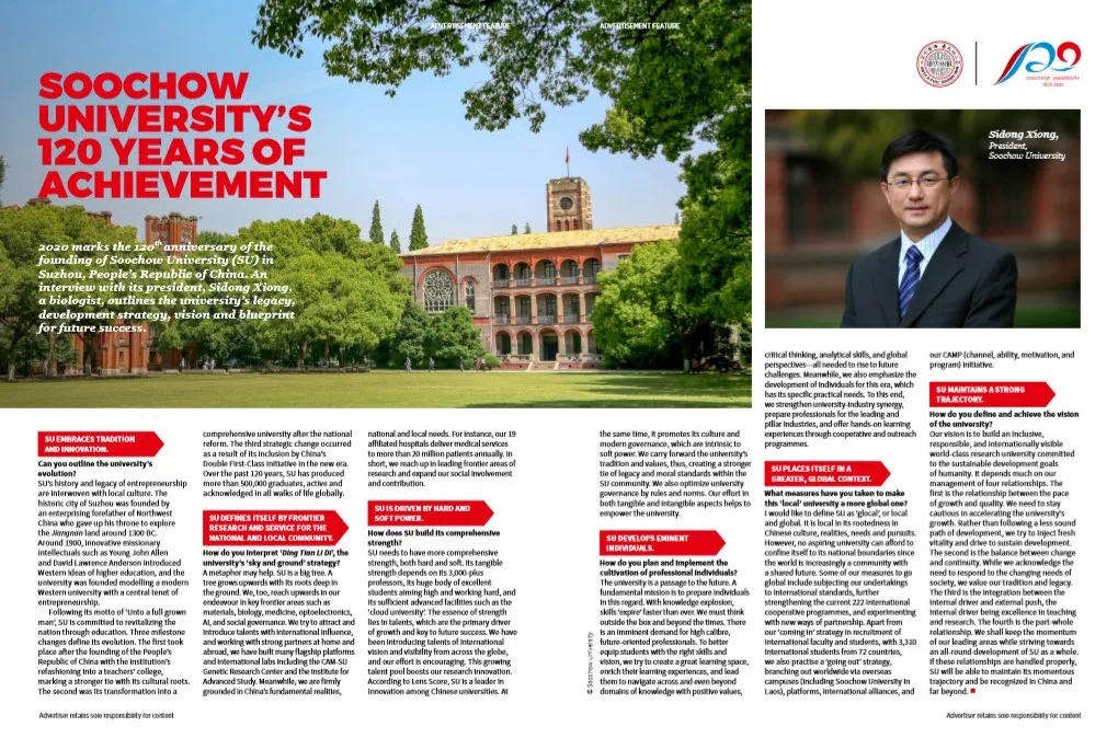 熊思东校长接受了世界顶尖学术期刊《Nature》特刊专题访谈,他以“Soochow University’s 120 Years of Achievements”为题,从学校如何在传承中实现创新发展、如何践行顶天立地发展战略、如何内外兼修提升综合实力、如何面向未来培养人才、如何在全球语境中界定自我、如何共启愿景以保持强势发展劲头等六个方面,向《Nature》全球读者介绍了苏州大学在120年办学历程中的治校理念、发展成就和前景蓝图。