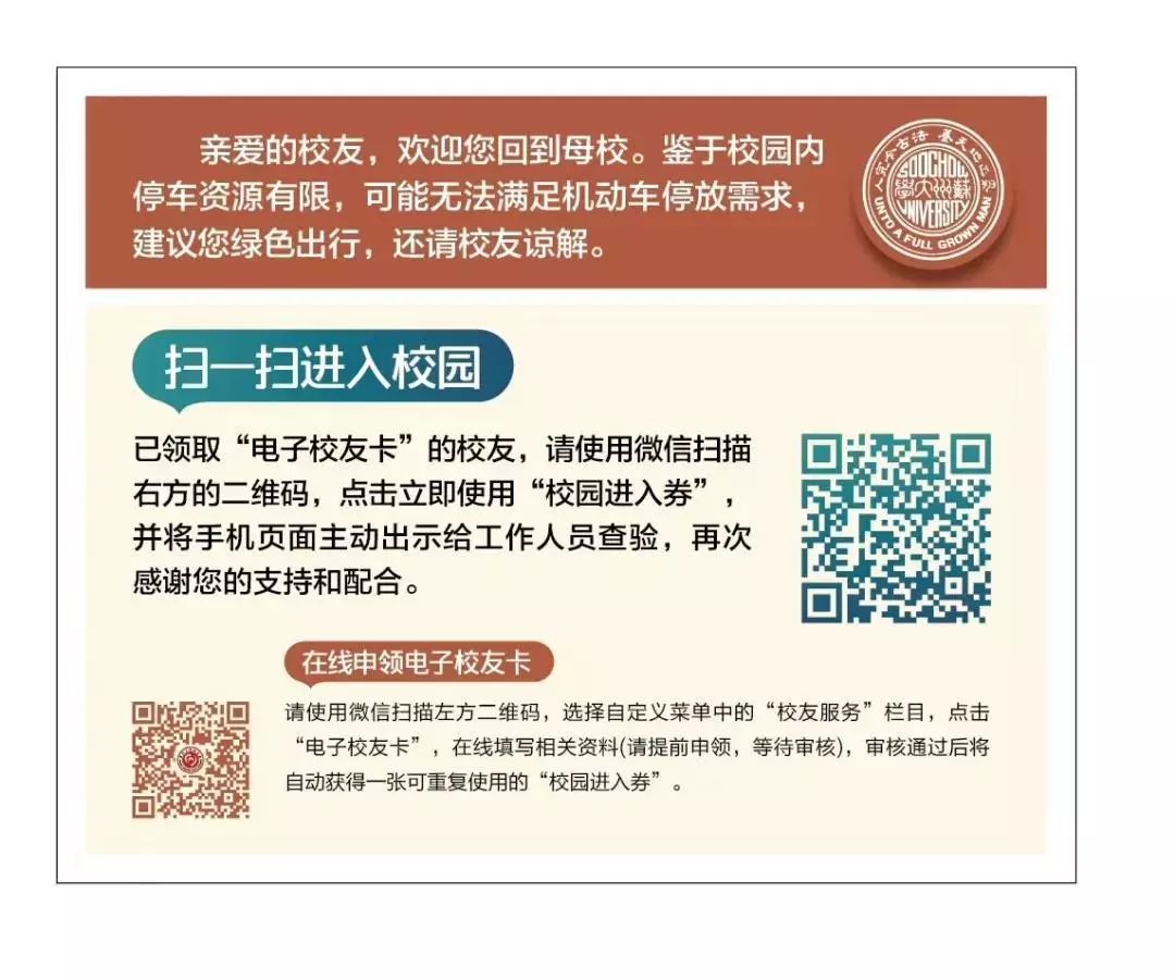 随着机动车辆的增加,校园内的空间已经非常有限,基于目前校内交通环境的现实情况,考虑到维护学校良好的教学环境,可能无法满足校友的机动车停放需求,建议校友回校时尽量选择绿色公共交通方式出行。