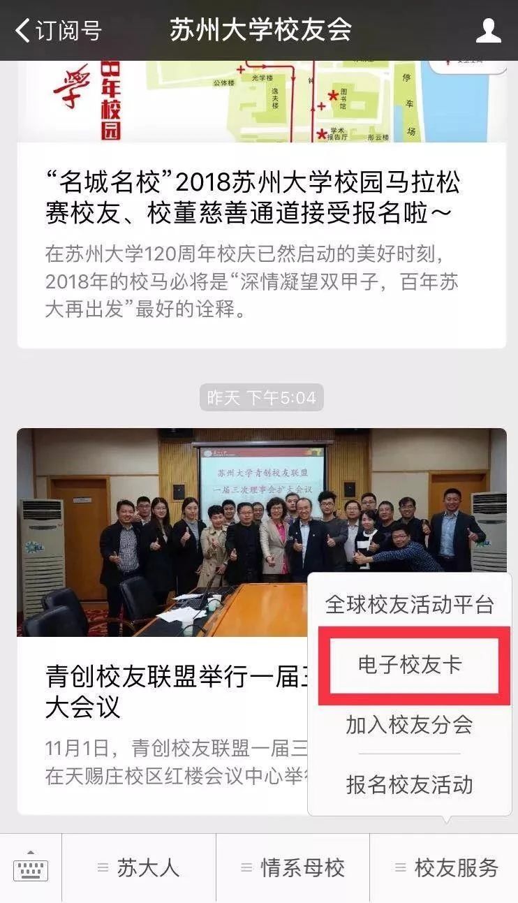 请校友们关注“苏州大学校友会”官方微信平台sudaxyh,在自定义菜单中的“校友服务”栏目中,点击“电子校友卡”进入申请页面填写信息提交,待校友信息认证审核成功后即可收到领取提示。