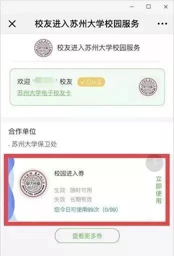 点击“校园进入券”,选择“立即使用”,进入欢迎页面后主动出示给门卫查看即可顺畅进入校园。