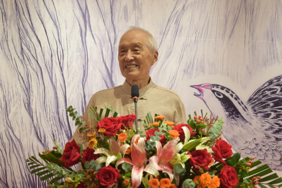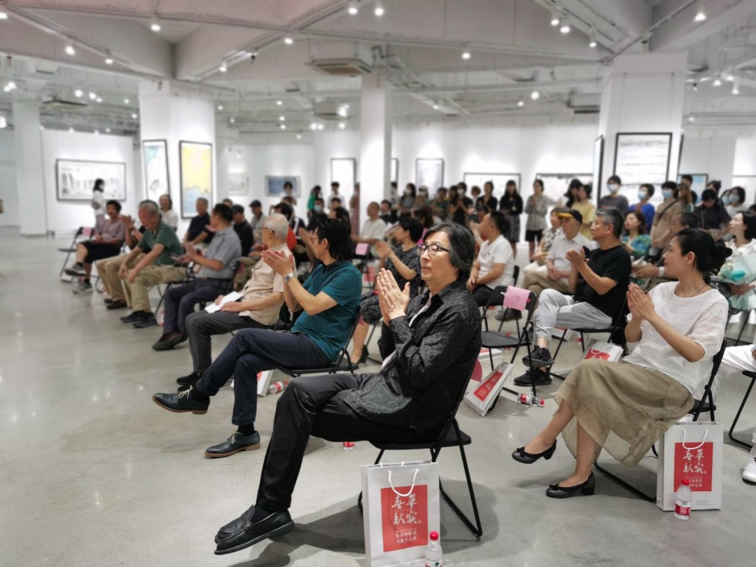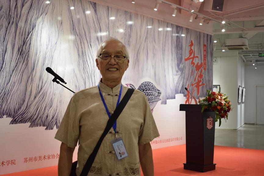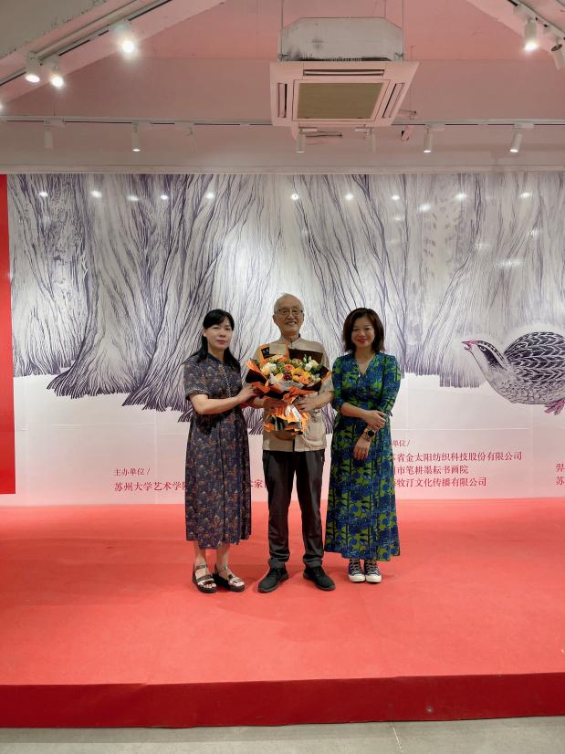 最后,苏州大学艺术学院退休教师朱春华教授上台发表感言,朱老师回顾了自身的创作历程,表达了如今作画时需克服双眼时而昏花、双手常颤抖的艰难,感慨了时光如白驹过隙,让我们深刻感悟到:“生命有限,人生无价,艺术探索无边。”他说:“作为年长的国画新人,谈不上在艺术创作领域里自由翱翔,只是在某些方面做了一些尝试,找到与创作题材相适应的表现方法,在动感中获得舒畅的均衡感,正是我在创作中思考的核心。”