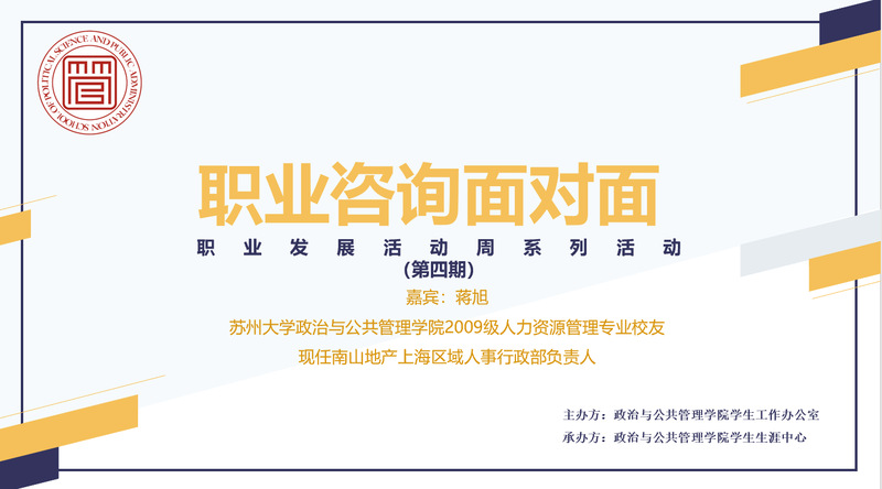 为助力2022届本科毕业生拥抱更美好的职业发展和未来,3月30日晚,“职业咨询面对面”(第四期)在腾讯会议上成功举办。本期特邀苏州大学2013届人力资源管理专业本科生校友、南山地产上海区域人事行政部负责人蒋旭,帮助同学们领会并掌握应届生求职的核心与技巧。