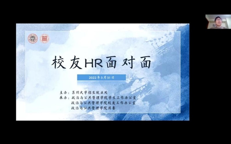 凝聚校友力量,同心共筑未来。3月31日,苏州大学招生就业处主办、政治与公共管理学院承办的“校友HR面对面”活动在腾讯会议上成功开展。此次活动特别邀请到了三位人力资源管理领域的优秀校友:大型科技制造集团人才开发部门HRD、苏州大学2003届校友郑圆圆;苏州盖美人力资源服务有限公司创始人、总经理、苏州大学2010届校友贺燕;德资头部车企大中华区人力资源经理、苏州大学2014届校友葛弘斐。苏州大学招生就业处副处长张芸,政治与公共管理学院党委副书记、副院长郝珺出席本次活动。