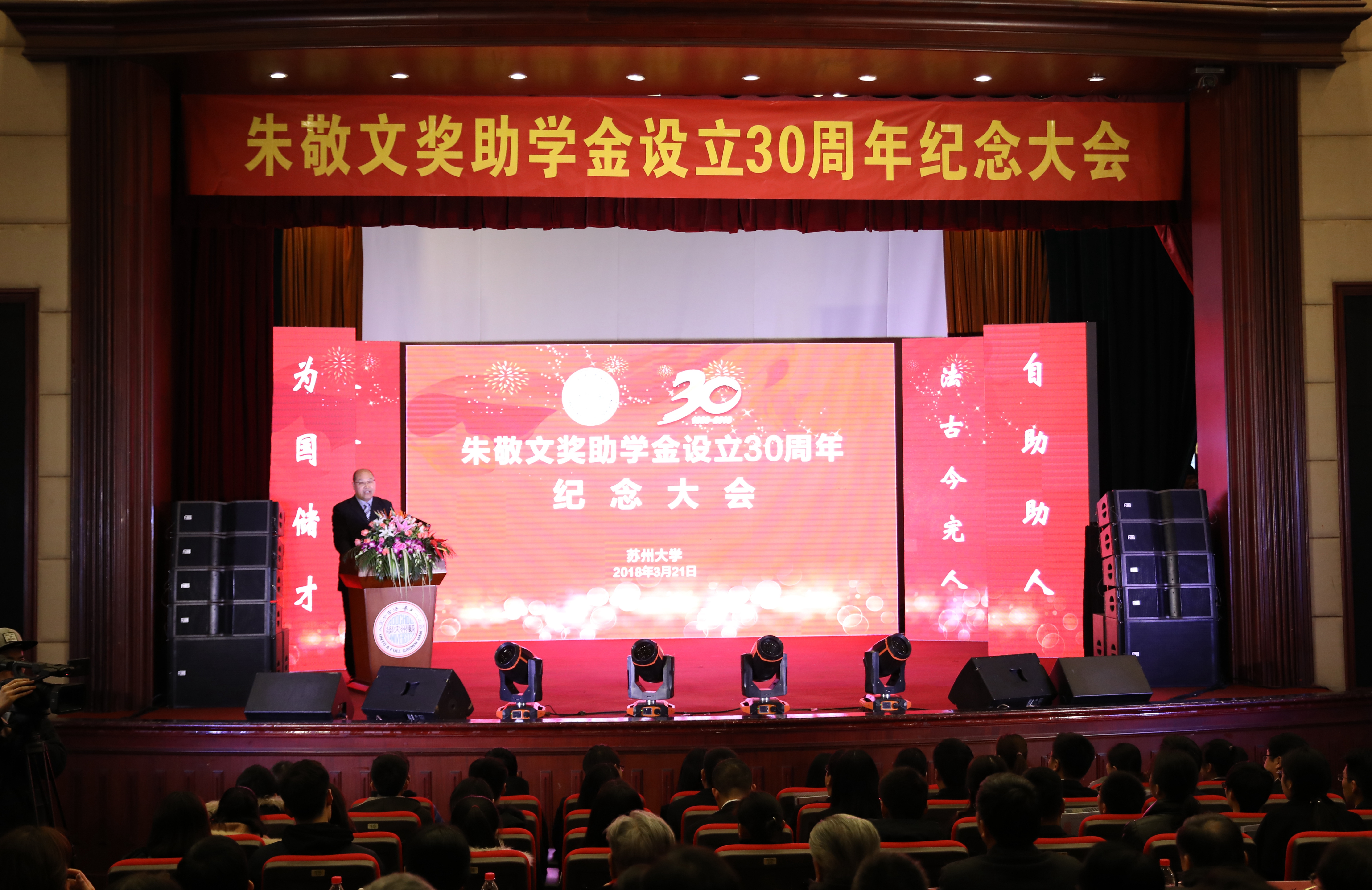 江涌在致辞中简要回顾了朱敬文先生的生平和他一生捐资助学、为国储才的义举,并对朱敬文教育基金会三十年来慷慨解囊、鼎力支持苏州大学发展表示衷心感谢。他说,朱敬文奖助学金的设立是朱敬文老先生一家热爱祖国、造福桑梓的爱国主义精神体现,也是他们一家扶危济困、乐善好施的传统美德体现,更是他们关爱祖国教育事业、关心帮助寒门学子的体现。三十年来,一批批受惠于朱敬文奖助学金的优秀学子从中受益,备受鼓舞,奋发成为社会各个领域的中坚力量。秉承“为国储才、自助助人”的敬文精神,苏州大学将怀感恩之心,以更加坚定的信念、更加执着的追求,坚持立德树人根本任务,为实现中华民族伟大复兴的中国梦培养更多高素质的优秀人才。